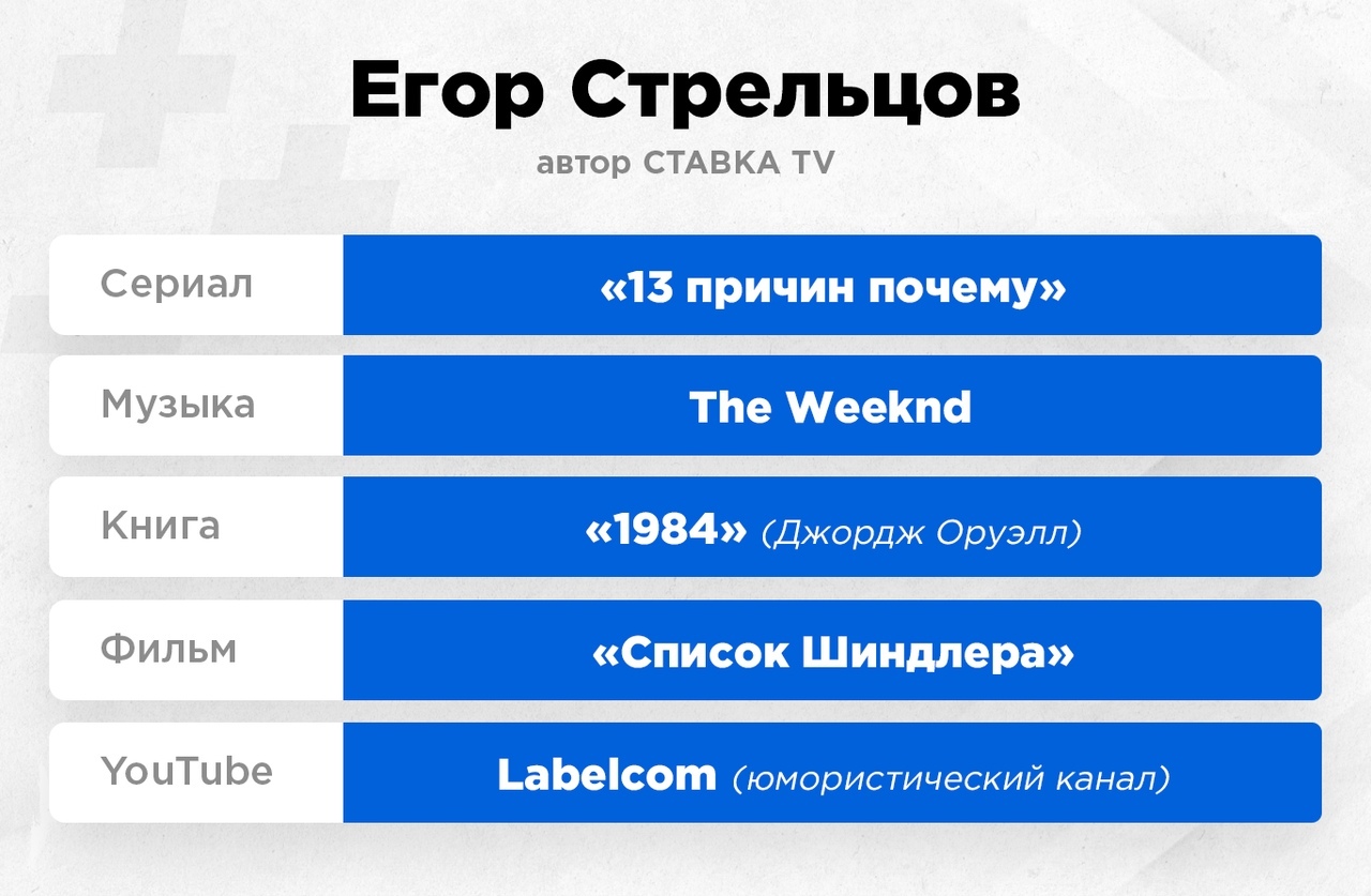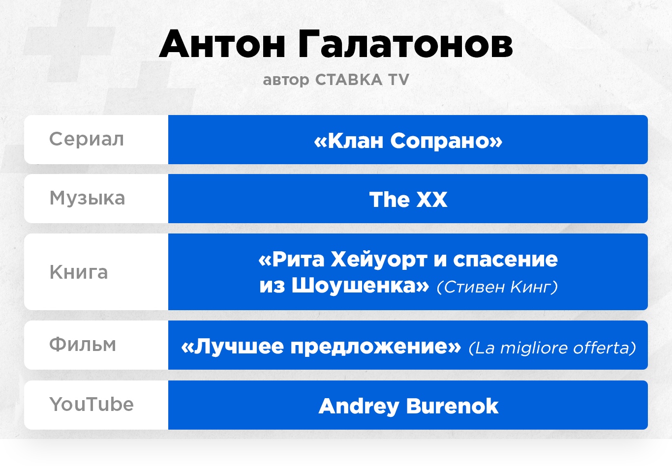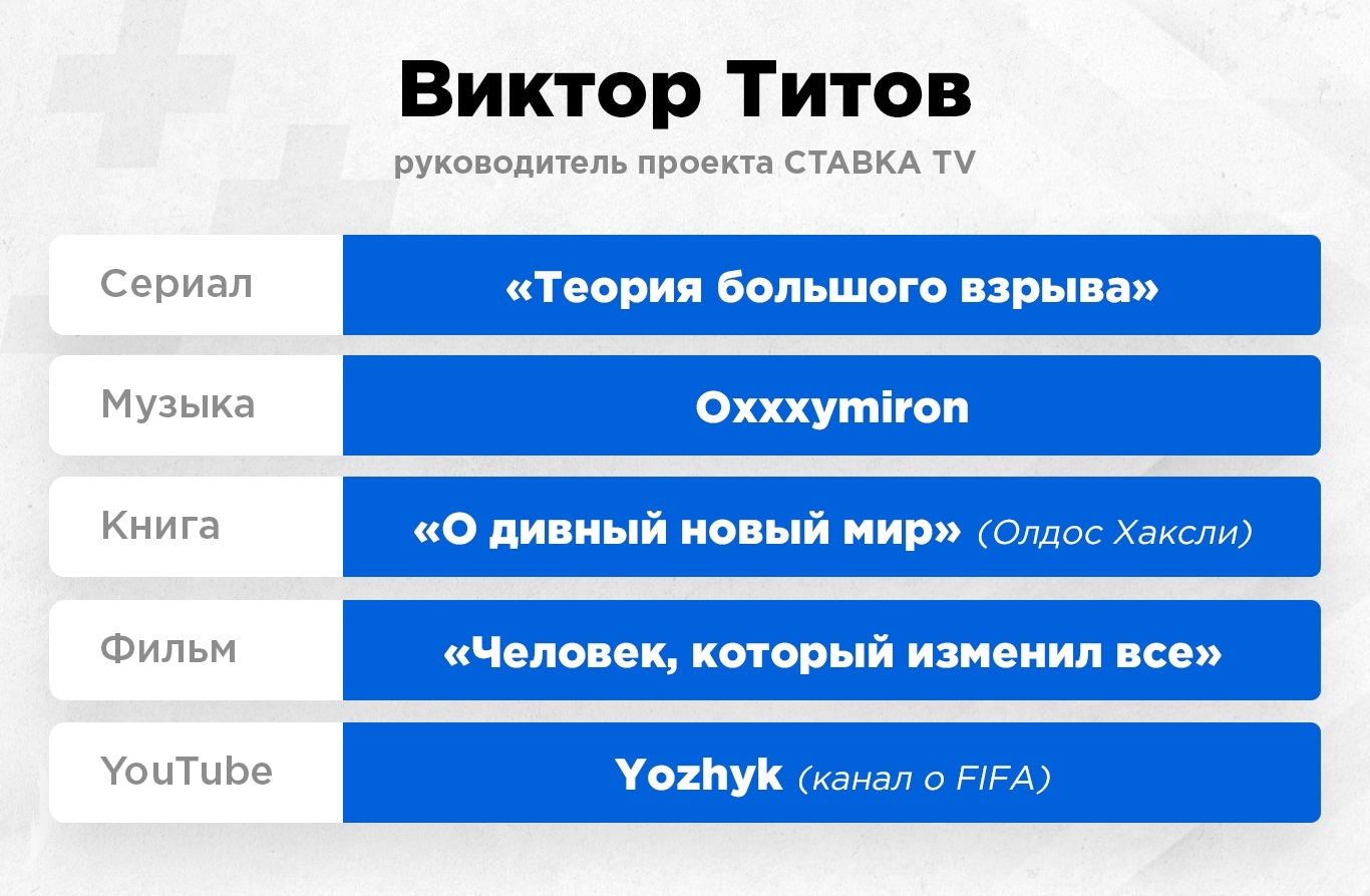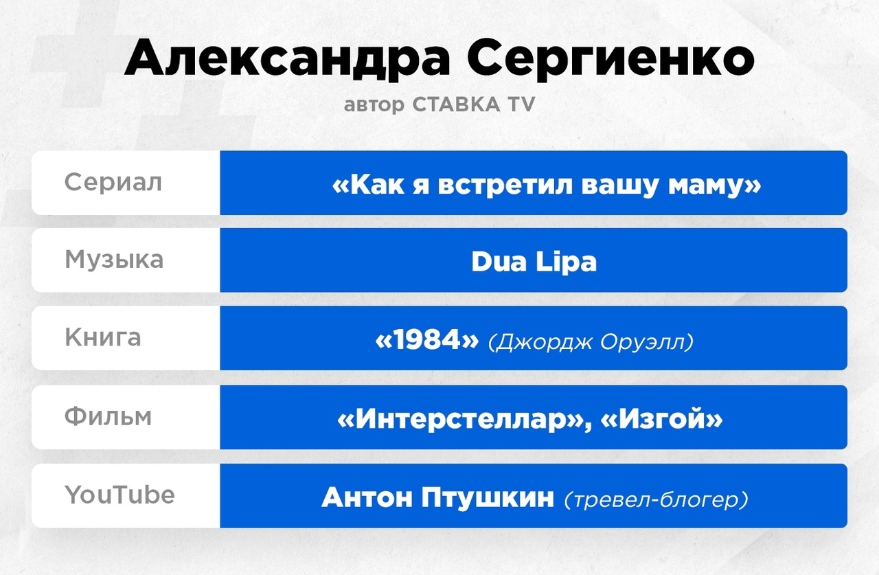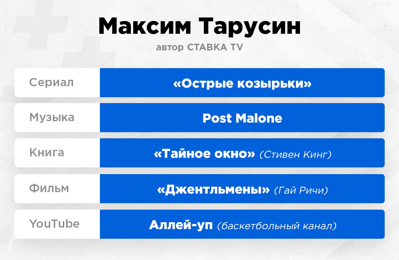 Недавно в нашем Instagram появился пост (организация признана экстремистской и запрещена на территории РФ), в котором эксперты СТАВКА TV рассказали о своих предпочтениях в музыке, сериалах и книгах. Как мы выяснили, Михаил Поленов любит комедии с Джимом Керри, а Роман Гутцайт слушает Робби Уильямса. Наши авторы решили не стоять в стороне и предложили свой список того, что можно посмотреть, послушать и почитать, находясь на самоизоляции. Каждый найдет себе что-то по вкусу и, может быть, вам станет ближе тот или иной автор. Погнали!