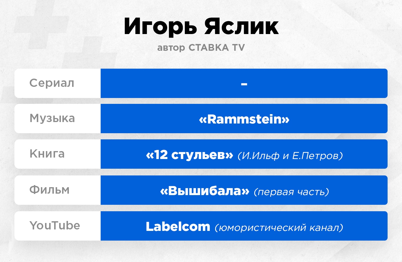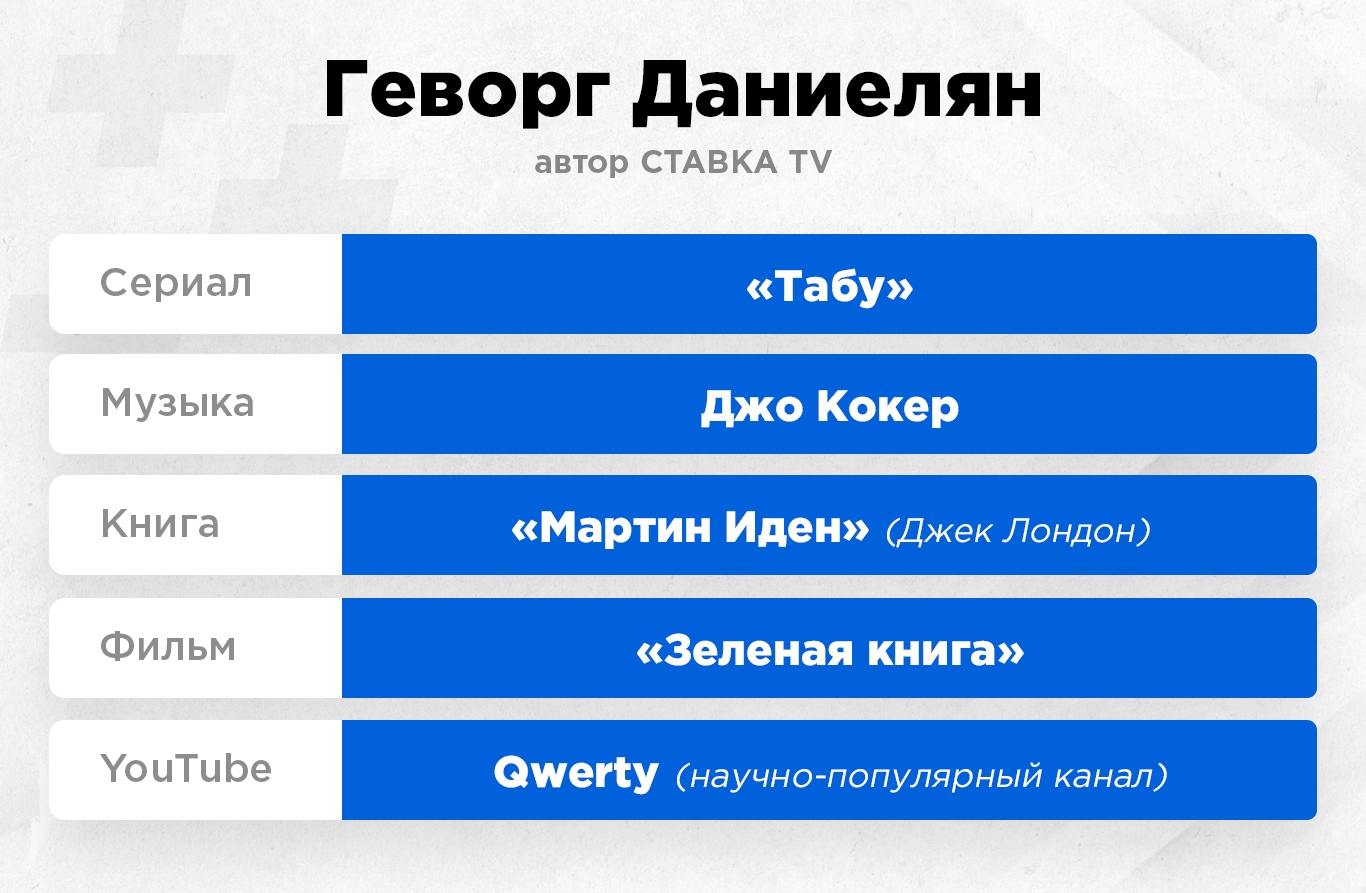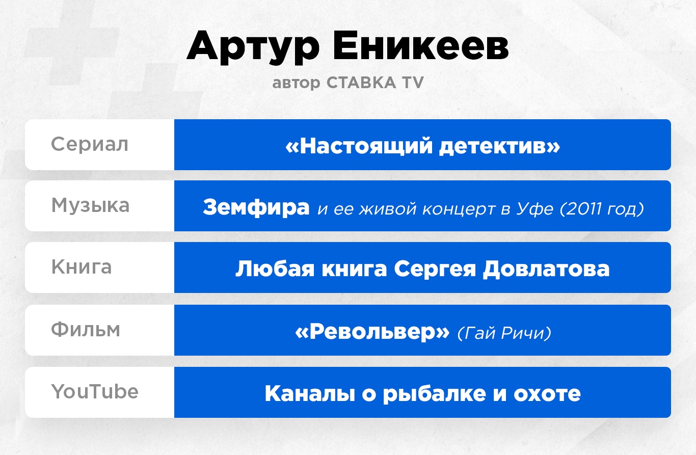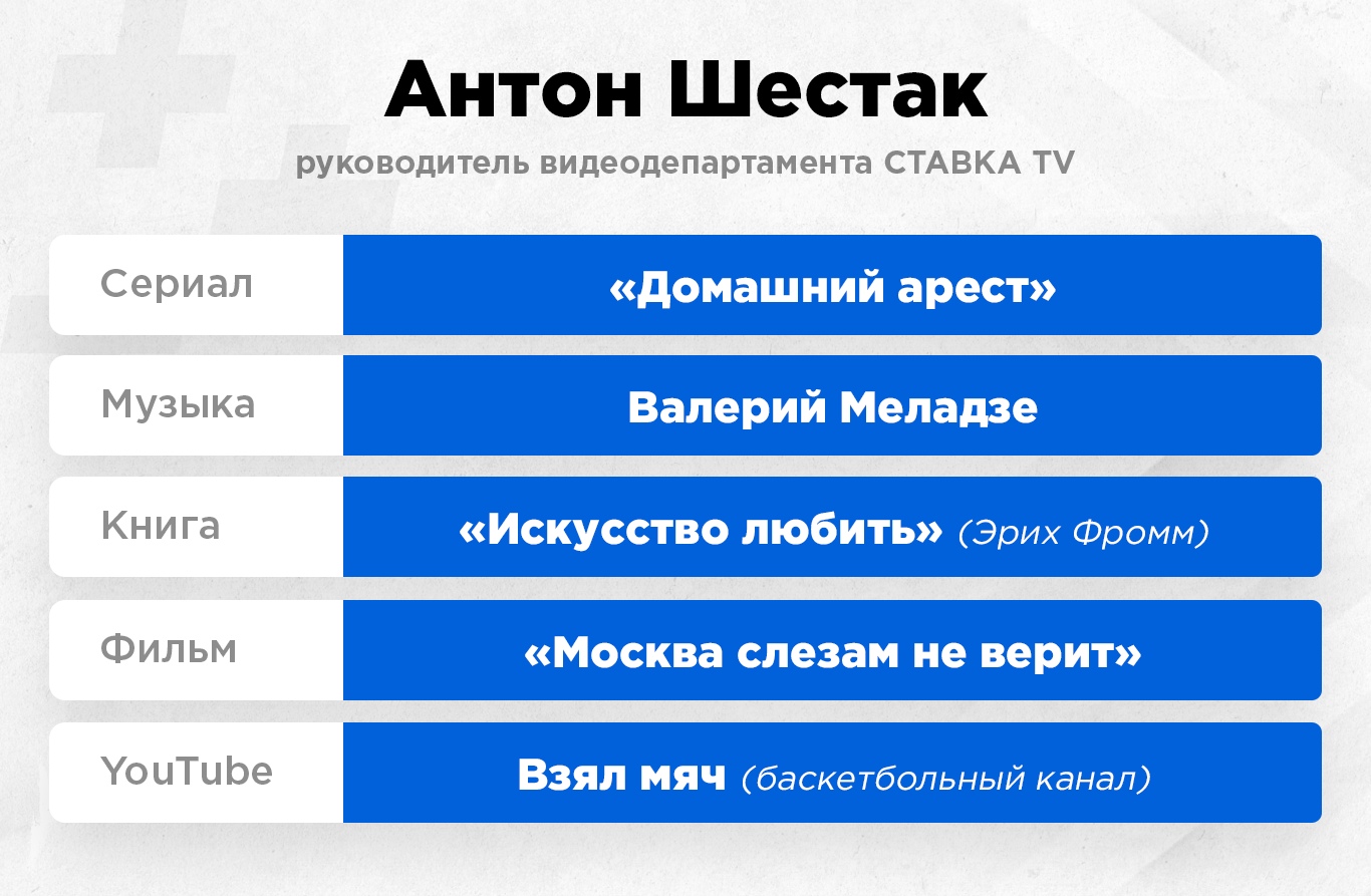 Недавно в нашем Instagram появился пост (организация признана экстремистской и запрещена на территории РФ), в котором эксперты СТАВКА TV рассказали о своих предпочтениях в музыке, сериалах и книгах. Как мы выяснили, Михаил Поленов любит комедии с Джимом Керри, а Роман Гутцайт слушает Робби Уильямса. Наши авторы решили не стоять в стороне и предложили свой список того, что можно посмотреть, послушать и почитать, находясь на самоизоляции. Каждый найдет себе что-то по вкусу и, может быть, вам станет ближе тот или иной автор. Погнали!