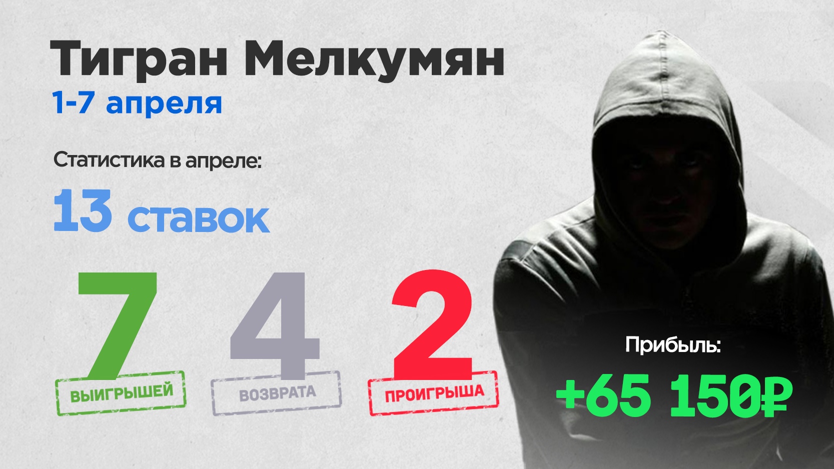 Свои первые прогнозы Тигран начал оставлять еще в декабре прошлого года, но лишь с февраля вступил в борьбу за призы основательно. Прошлый месяц он завершил с показателем +38 850 рублей в своем активе, а в апреле стартовал еще лучше. Семь точных ставок со средним коэффициентом 3.14 позволили ему заработать 65 150 рублей и вплотную подобраться к лидеру первой апрельской недели. Отметим, что особенно успешно Тигран действовал на территории Никарагуа.