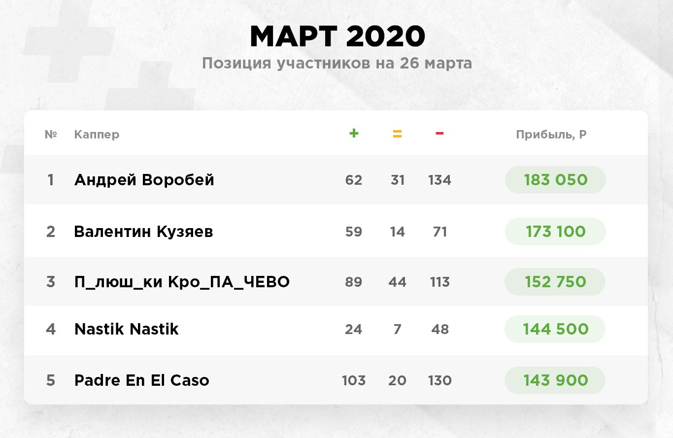 И вновь мы хотим обратить внимание на человека, который отличился благодаря своему высокому винрейту. Мы сравнили 25 лучших игроков по итогам мартовского конкурса, чтобы найти в итоге Дмитрия Морина. Наш каппер заработал в прошлом месяце 114 900 рублей, залетев попутно на 18-ю строчку в рейтинге. Но более примечательным является тот факт, что из 105 совершенных прогнозов, 67 оказались абсолютно точными (63.8%).