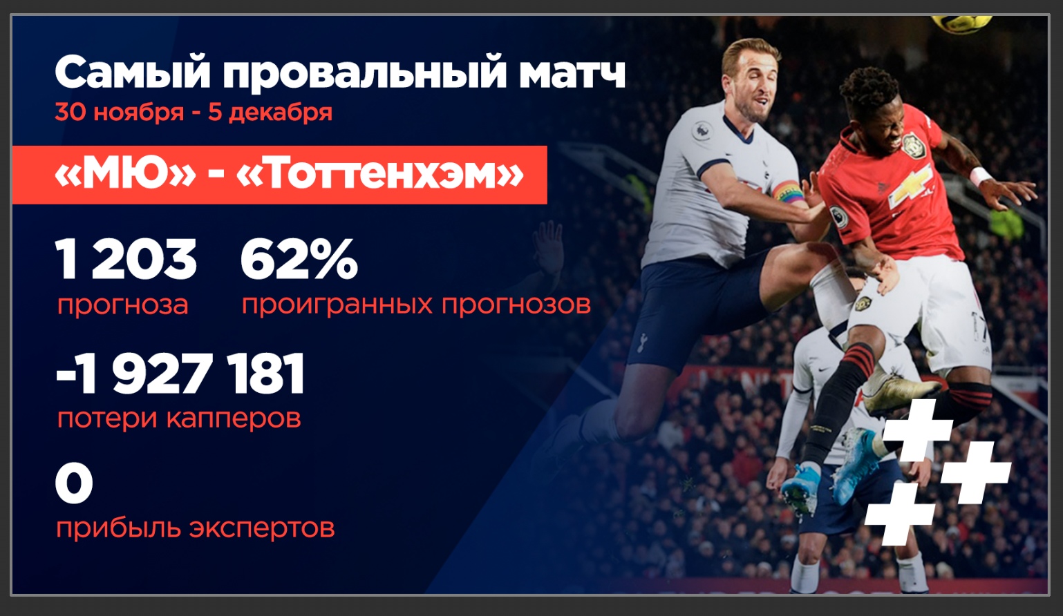1203 человека выделили средства из своего банка на эту игру, сделав ее самой популярной за последнюю неделю, а вот вера в "Тоттенхэм" Моуринью улетучилась вместе с деньгами, форами, тоталами и ставками на победу. Почти два миллиона рублей (-1 927 181) потерь — настоящая катастрофа.