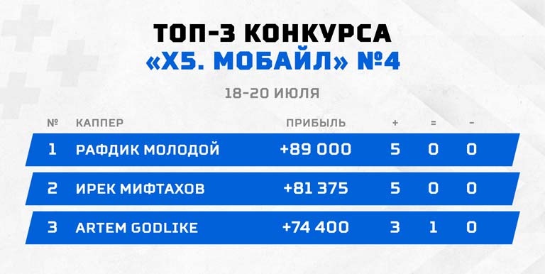 Перед тем, как вернуться к итогам конкурса "Х5 Мобайл", мы должны обязательно упомянуть о сражении эксперта с чемпионом предыдущего выпуска по оригинальным правилам акции. На этот раз в баттле с Романом Гутцайтом выступал Геннадий Тимершин. Он не оставил шансов нашему эксперту, обыграв его со счетом 4-1. Это уже вторая подряд победа для капперов проекта и 5 000 бонусных рублей сверху для Геннадия. Поздравляем!
