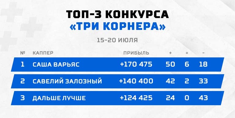 Несмотря на это, Савелий последний игровой день провел осторожно, сумев значительно увеличить свою прибыль, а вот Алексея поджидала неудача. Лишь один прогноз из семи за 20-е июля оказался точным, что откинуло его с третьей позиции сразу на седьмую. Этой ситуацией воспользовались несколько участников, в том числе каппер "Дальше лучше". Лишь 35,82% его прогнозов оказались точными, но все это следствие игры на высоких коэффициентах. Тем не менее, подобная стратегия не помешала пользователю втиснуться на третью строчку. Куда дальше?