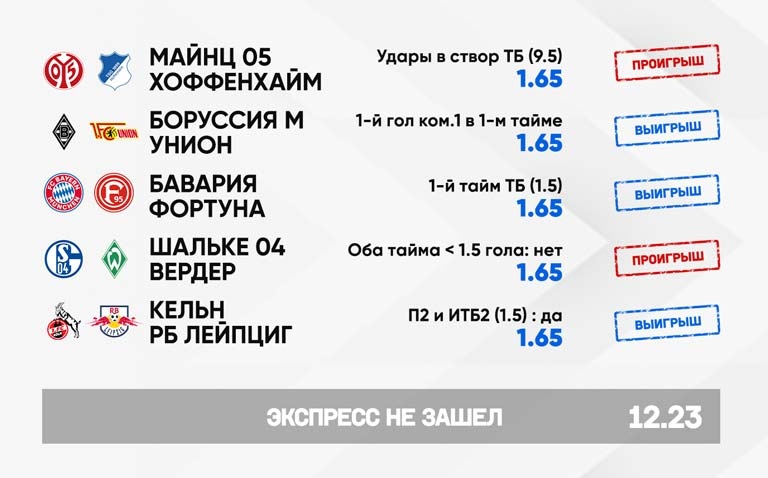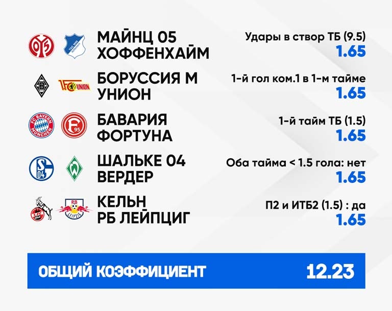 Из "проходящих" коэффициентов вспоминается 1.65 для BetCity, о чем приходилось неоднократно слышать. Опираясь на это чужое убеждение в выходные, мы составили экспресс на матчи немецкой Бундеслиги. Отбирали исключительно коэффициент 1.65 и старались добавлять те события, которые логичны и реальны в своем проходе.