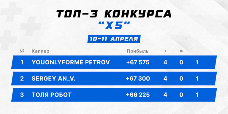 На коне в этот вечер был "YouOnlyForMe Petrov". Да, именно этот парень рискнул заиграть индивидуальный тотал по желтым карточкам "Атлетико" меньше 1.5. Такой риск букмекеры оценивали в 3.50, а это 18 750 чистыми для каппера и взлет на вершину списка из-за пределов двадцатки лучших. Понимаете весь масштаб трагедии для ребят, находящихся в топе? "YouOnlyForMe Petrov" волноваться по этому поводу не должен, он — победитель очередного выпуска "Х5", обладатель 5 000 рублей и купона!