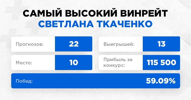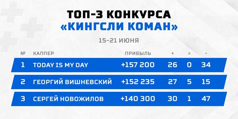В вопросе основных недельных конкурсов нам часто приходится затрагивать тему процента успешных попаданий. Текущая специфика турнира такова, что даже с винрейтом 29,62% можно оказаться в числе призеров. Подобное достижение записал на свой счет Николай Калина. Мы желаем каждому из вас столько удачи, сколько свалилось на Николая 21-го июня. Все дело в том, что до этого момента процент успешных попаданий был гораздо ниже, но 15 прогнозов в последний конкурсный день принесли успех: 12 прогнозов с кэфом выше 3,50 и 109 800 рублей чистой прибыли буквально за один день!