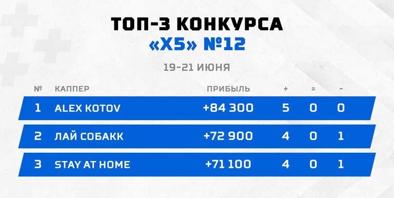 В отличие от одиннадцатого выпуска конкурса "Х5″, который установил антирекорд результативности за время существования этого турнира в нашем проекте, последний розыгрыш прошел по всем канонам блиц-соревнования: 3,24 средний коэффициент победителя, 84 300 рублей прибыли, пять точных исходов из пяти! Разве есть сомнения в профессионализме каппера Alex Kotov? Именно он забирает заслуженные 10 000 рублей, и к концу этой недели сразится в дополнительном раунде с экспертом проекта. Поздравляем!