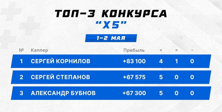 Символично, что вторую и третью строчку на пьедестале почета заняли участники, у которых в графе заходов красуются 5-0-0. Сергея Степанова и Александра Бубнова на финише разделили мизерные 275 рублей прибыли! Интересно, что из пяти матчей у участников совпали выбранные исходы только в двух случаях. Преимущество Александра в статусе можно было преодолеть только благодаря лучшему среднему коэффициенту, и он Сергея Степанова не подкачал: 2.82 против 2.34.