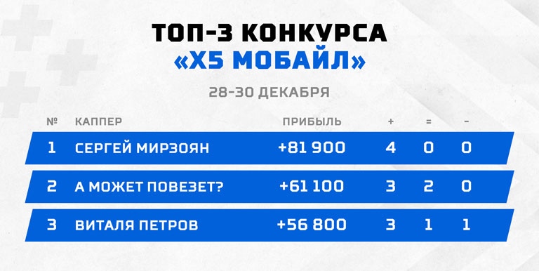Барабанная дробь… Сергей Мирзоян! Поздравляем его с заслуженным первым местом. Сергей совершил всего четыре прогноза, зато все с хорошими кэфами и все точные. 5000 рублей на Новый год, что может быть приятнее? Теперь же оставляем вас наедине со всеми призерами “Х5 Мобайл”. Но это еще не все, ведь сразу за ними итоги еще одного турнира!
