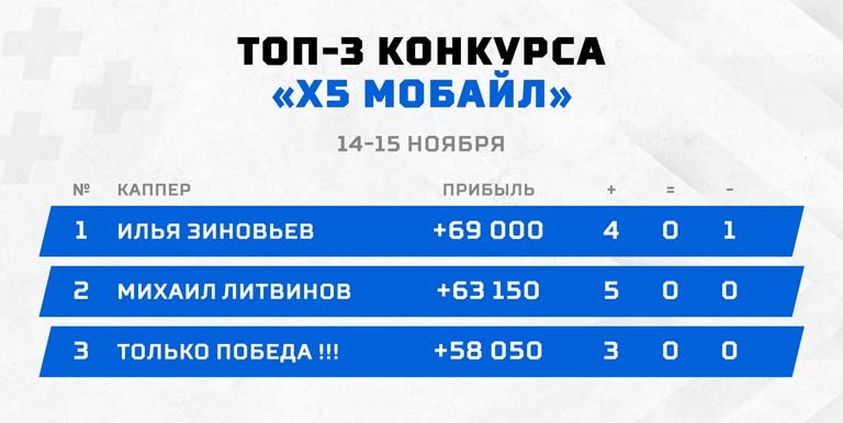 Помните каппера с ником “Только победа !!!”? Ему пока не удалось воплотить пророчество имени в реальность, но каждый раз он оказывается очень близко к успеху. В конкурсе “Заряжен на РПЛ” (12-14 сентября) он был шестым, в “Х5 Мобайл” под номером восемь – восьмым, а в августовском “Евротуре” остановился в шаге от победы. Сегодня ему вновь не хватило немного до долгожданного триумфа. Отмечаем, что каппер “Только победа !!!” совершил в рамках конкурса три прогноза, но и этого хватило, чтобы взлететь на пьедестал почета. Наши поздравления!