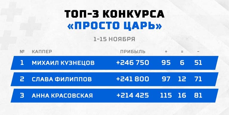 Третий пункт не столь радостный. Точнее, он очень грустный. Сразу четыре участника конкурса “Просто царь” получили дисквалификации за различные систематические нарушения в обоснованиях своих прогнозов. Жаль, но таковы правила.