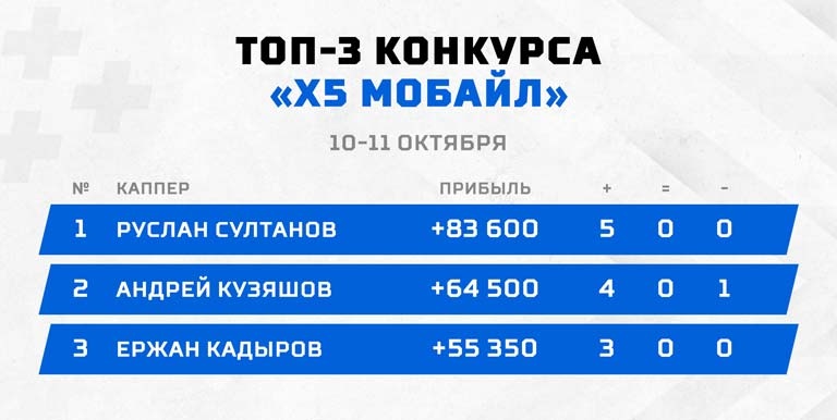 Многочисленная армия пользователей СТАВКА TV уже подготовила нового претендента на победу в битве. В следующий раз свои силы попробует Руслан Султанов: 83 600 прибыли, 5 из 5 точных выстрелов, 2.67 средний коэффициент. Достойно? Более чем! После старта с тремя рискованными прогнозами Руслан решил сыграть в завершающей стадии аккуратно и точно. Такая тактика позволила ему пройти все контрольные отметки в числе лидеров, а захваченная после матча Англия – Бельгия первая строчка так и осталась недосягаемой для других. Поздравляем нового чемпиона "Х5 Мобайл"!