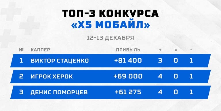 Мы рады за тех, кто сумел почувствовать вкус победы, но обязательно обращаем внимание на ребят, которые прошли всю дистанцию блиц-турнира без единой осечки. Точнее, на одного человека в этот раз. Судя по прогнозам, каппер Евгений Ильич потерял надежду на успех в основном конкурсе и целенаправленно участвовал именно в "Х5 Мобайл". Он комбинировал высокие коэффициенты с более надежными исходами, что привело его к результату 100% и четвертому месту в конкурсе.