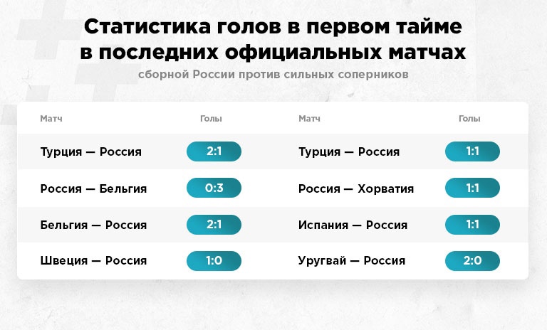 Логика в статистике подобных матчей. У сборной России с 2018 года 12 матчей, где она шла андердогом, то есть коэффициент на победу был выше 2.50. В среднем за первый тайм в этих матчах соперники забивали полтора гола. Статистика по ставке 5+ 6= 1-, что очень приятно для коэффициента 3.45. Без учета товарищеских игр вообще пропускали во всех первых таймах, а по ИТБ(1) у соперника 4+ 4= 0-.