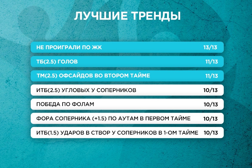 Ну это трендище точно на заметку. 8 побед по желтым карточкам и 5 ничьих, ИТБ(1.5) в 11-ти матчах из 13-ти.