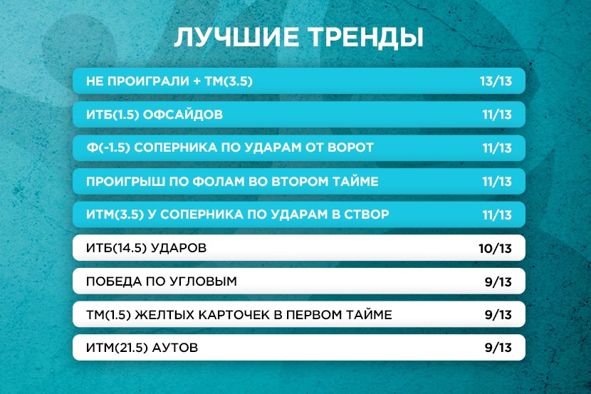 Общий тотал 3.5 также был пробит в 11-ти из 13-ти матчей, но больше в офсайд попадают именно сами, а не ловят соперников. Еще интересен тренд на общий ТБ(1.5) в первом тайме, по статистике из нашей выборки ставка прошла в 12-ти матчах.