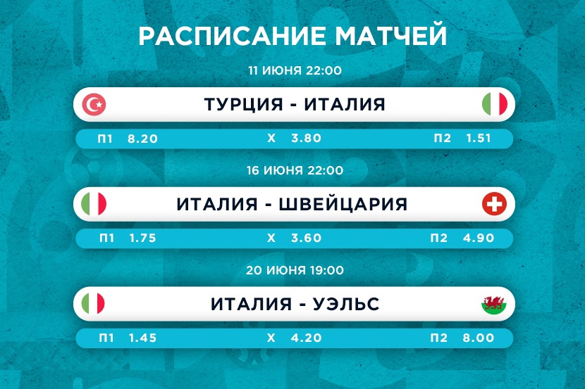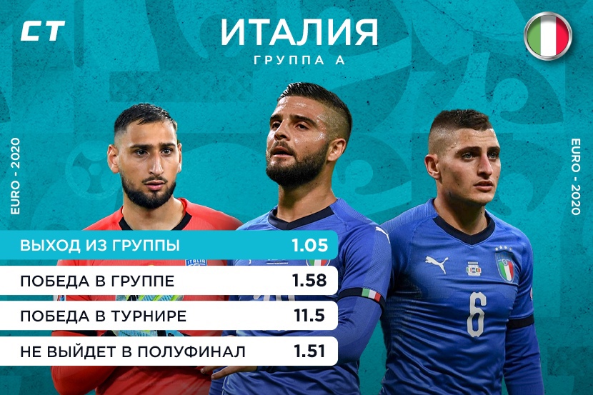 Как уже отмечено выше, итальянцы в числе восьми главных претендентов на титул. Их победа на Евро оценивается коэффициентом 11.5. Выход в финал - 5.5. В полуфинал - 2.4. В четвертьфинал - 1.45.