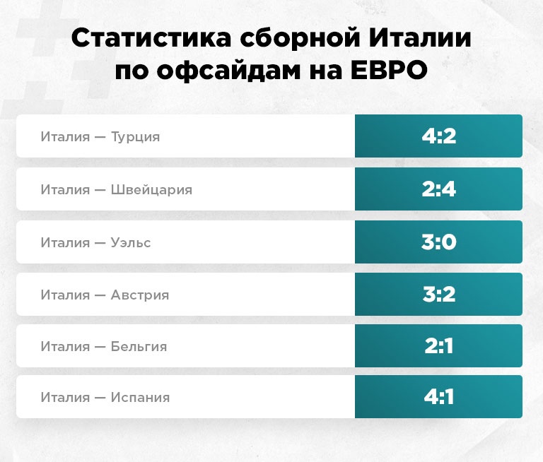 Итальянцы очень много офсайдов зарабатывают, на ЕВРО в шести из семи матчей выиграли по этому показателю. Проиграли только Швейцарии, у которой еще лучше статистика, там средняя разница +2, наверно самая плюсовая в Европе.