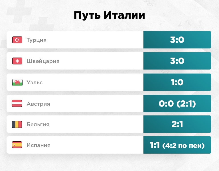Путь Италии к финалу, безусловно, получился очень сложным, особенно на поздних стадиях плей-офф, когда в соперниках оказывались мощная Бельгия и прекрасная Испания. Тем не менее, "Скуадра Адзурра" находила ключи к каждому своему противнику. Найдет ли их Роберто Манчини в финальном поединке против Англии?