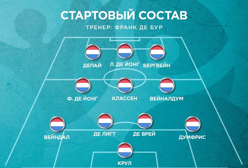 Сборная Нидерландов традиционно едет на любой турнир в качестве одного из главных фаворитов. Вот и нынешний чемпионат Европы не станет исключением. Когда у тебя в составе выступают такие люди, как де Йонг, Депай, де Лигт и Вейналдум, ты просто не имеешь права ставить перед собой других задач, кроме победы.