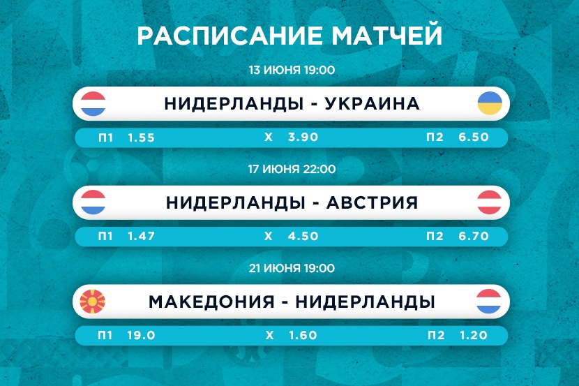 На то, что Нидерланды станут чемпионами Европы заключаются пари с коэффициентом 10. Выше оцениваются шансы Испании (8), Германии (8), Бельгии (6,50), Англии (6,50) и Франции (6,50).