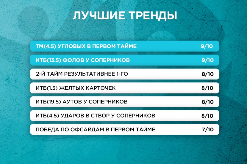 Такая же статистика по ИТМ(2.5) в первом тайме, но, учитывая уровень соперников, такой индивидуальный тотал вряд ли будут давать.
