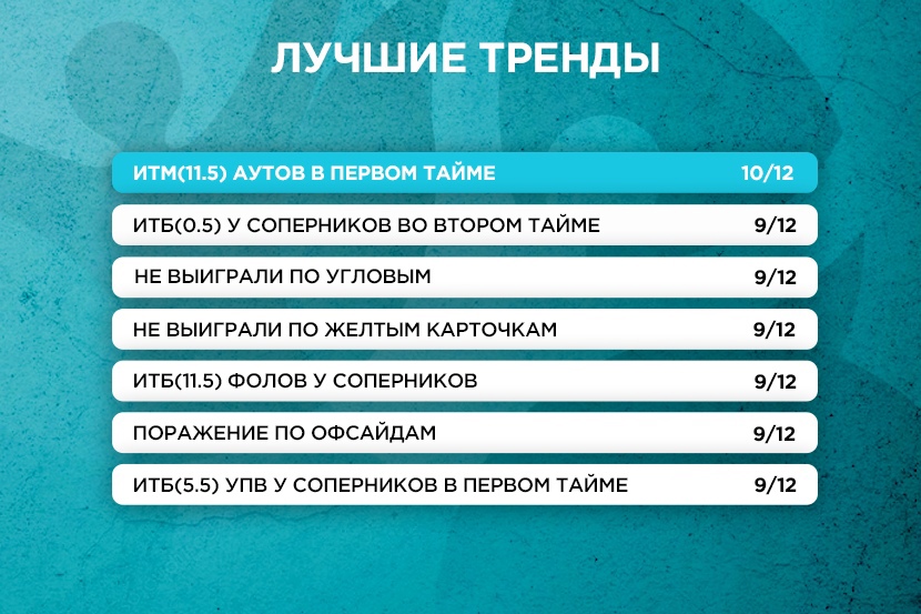 Также стоит отметить, что в 10-ти из 12-ти матчей соперники пробили ИТБ(3.5) угловых.