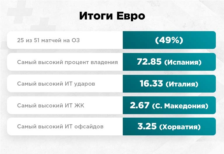 Еще один очевидный тренд этого Евро. С первых туров было заметно, что судьям поступила рекомендация не жестить с горчичниками. Средний тотал 2.72 тому яркое доказательство. Ставка на ТМ (4.5) ЖК на этом Евро зашла в 45 из 51-го матча. Да, ближе к плей-офф букмекеры заметили эту тенденцию и начали занижать коэффициенты на ТМ, но в лайве часто можно было схватить за хороший кэф. В первом туре группового этапа ставка зашла во всех 12-ти матчах (11 из них на ТМ (3.5) даже). Второй тур вышел грубее: здесь 10 из 12-ти игр на ТМ (4.5) ЖК. В третьем туре группового этапа по ТМ (4.5) ЖК 11+1-. В плей-офф по ТМ (4.5) горчичников 12+3-, но все три минуса были на стадии 1/8. 88% заходов - это ли не классный вариант! Подобная статистика и тренды часто помогают на практике. "Х50. Игра на пятьдесят миллионов" от Winline - отличный способ применить свои знания!