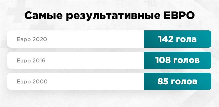 Сразу же хочется отметить один факт: Евро-2020 стал самым результативным в истории (142 гола). Да, в формате 51 матча это лишь второй турнир (на Евро-2016 было забито 108 голов), но по показателю среднего количества голов за матч (2.78) Евро-2020 стало самым результативным, начиная с 1976 года (тогда на Евро было всего 4 матча).