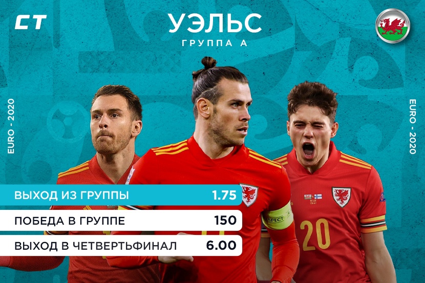 Сборная Уэльса в числе андердогов турнира. На их титул предлагается коэффициент 150, выход в финал - 50, в четвертьфинал - 6.00. Тем не менее, выход из группы котируется вполне реальным коэффициентом 1.75. По мнению букмекеров, побороться с Турцией и Швейцарией за 2-3 место Уэльсу вполне по силам.
