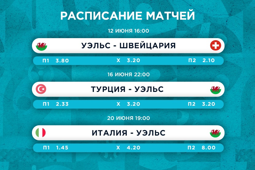 На групповом этапе букмекеры ждут от валлийцев 3 набранных очка и 3-4 примерную разницу забитых пропущенных мячей. Коэффициент на победу в матче против Италии - 8.00, против Турции - 3.20, против Швейцарии - 3.80.
