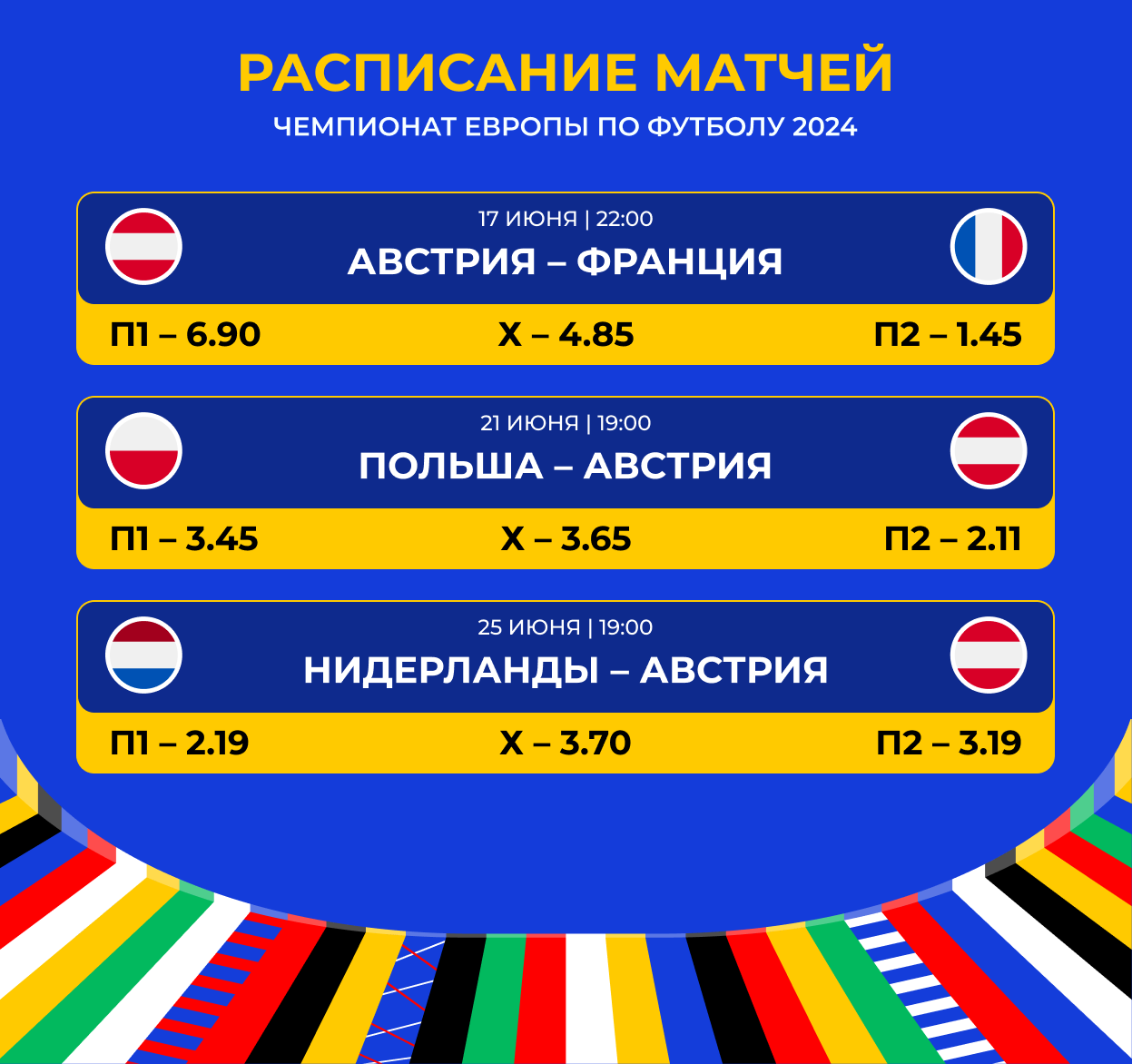 Австрия выйдет из группы1.90 Австрия выиграет Евро80