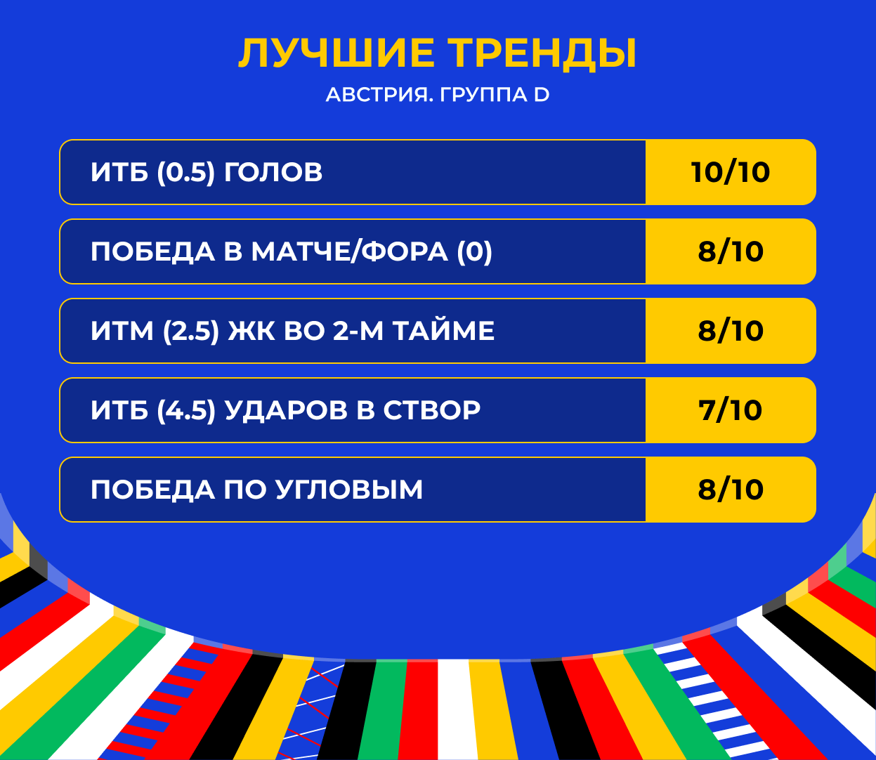 Дисциплина и выдержанность. Австрийцы не играют грубо в концовке матчей, даже если все идет не по их плану. Здесь можно рисковать и ставить на ИТМ (2) карточек, ведь такой исход без возврата зашел в 6/10 случаев в играх Австрии за 2023/2024 гг.