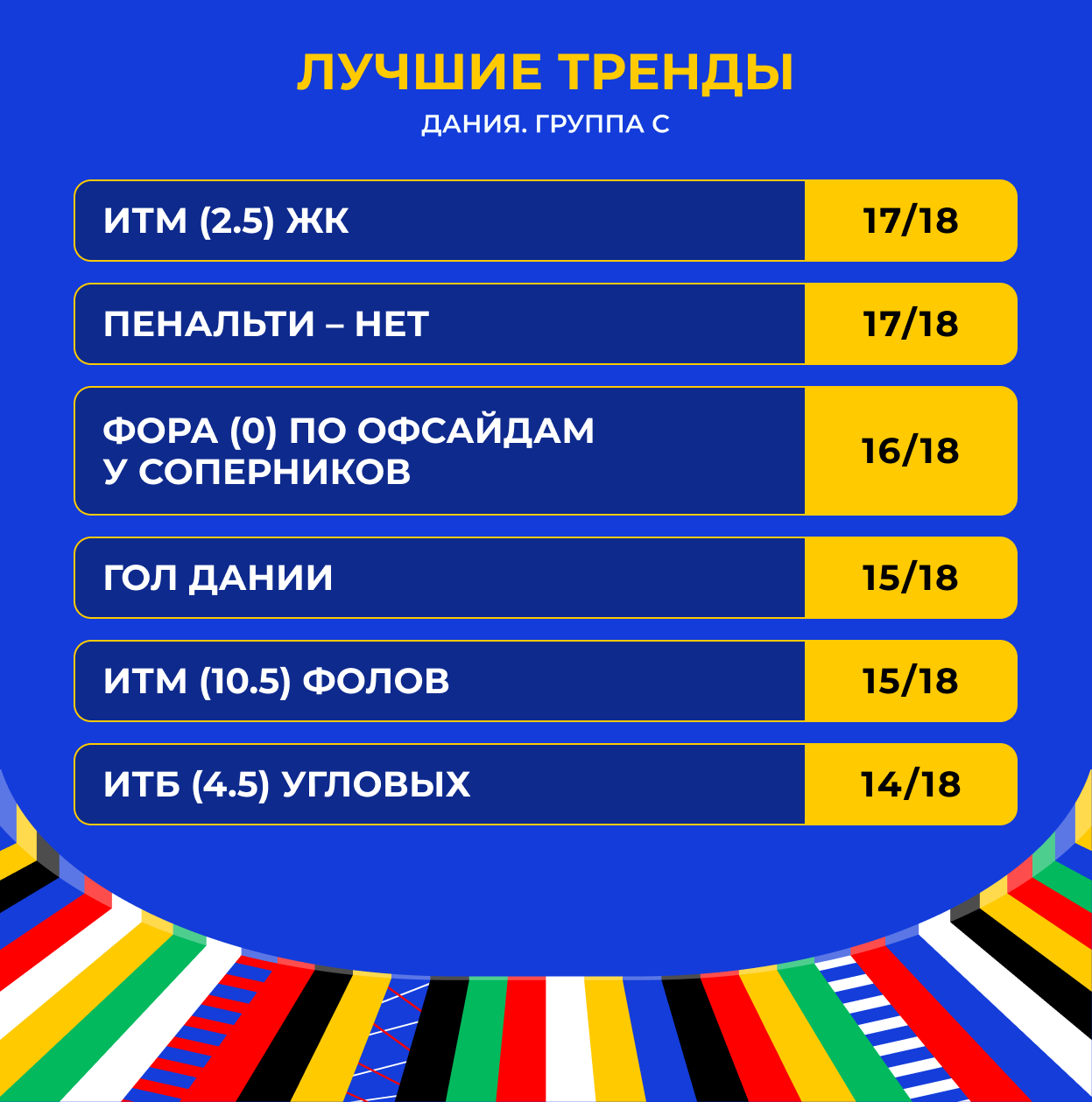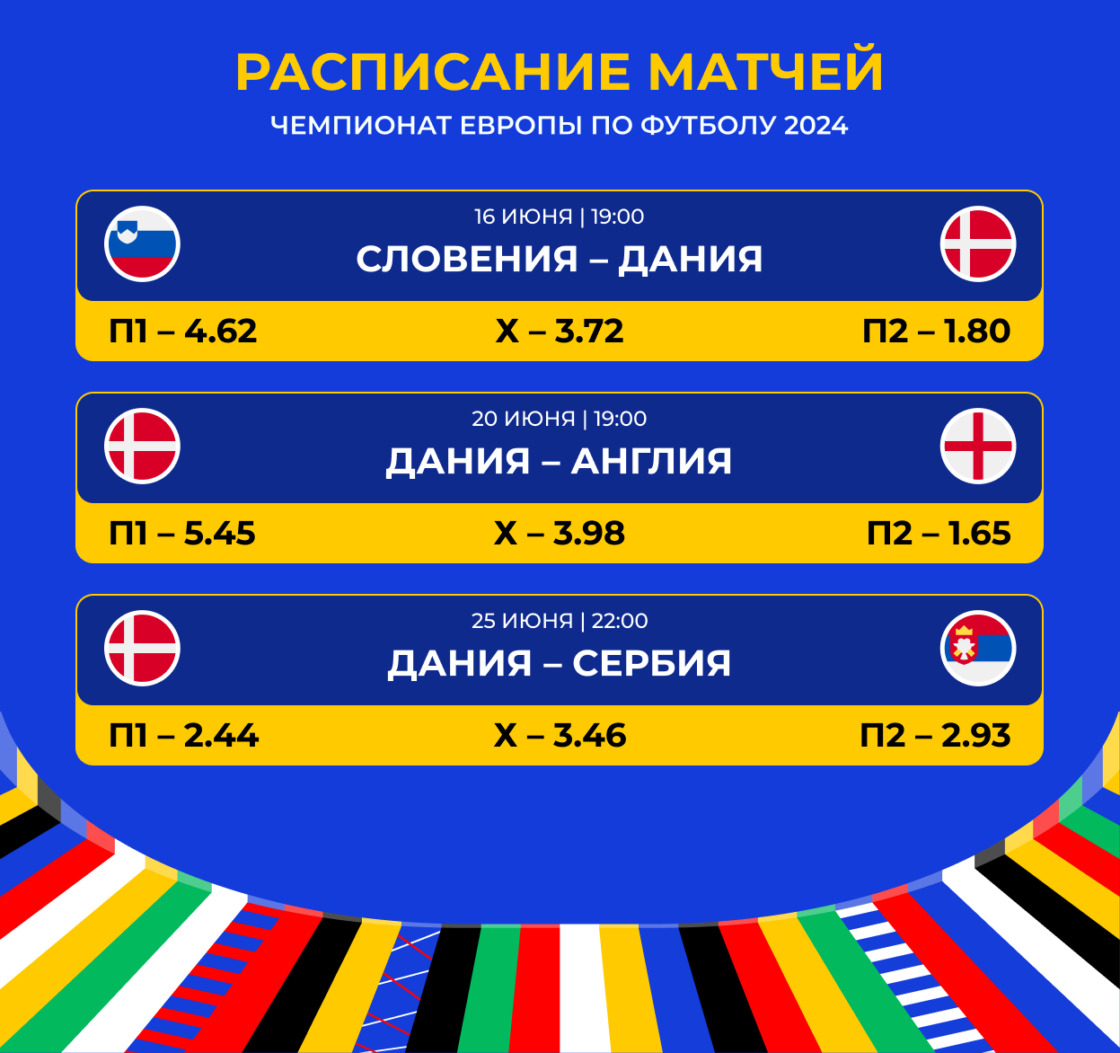 Дания – это не гранд, но команда чуть выше крепкого середняка. Она определенно переросла средний уровень, но недотягивает до топов. На прошлом Евро скандинавы дошли до полуфинала и получили бронзовые медали турнира. Повторить достижение будет в разы сложнее, но и выход в четвертьфинал станет неплохим результатом. Такой исход идет с коэффициентом 3.