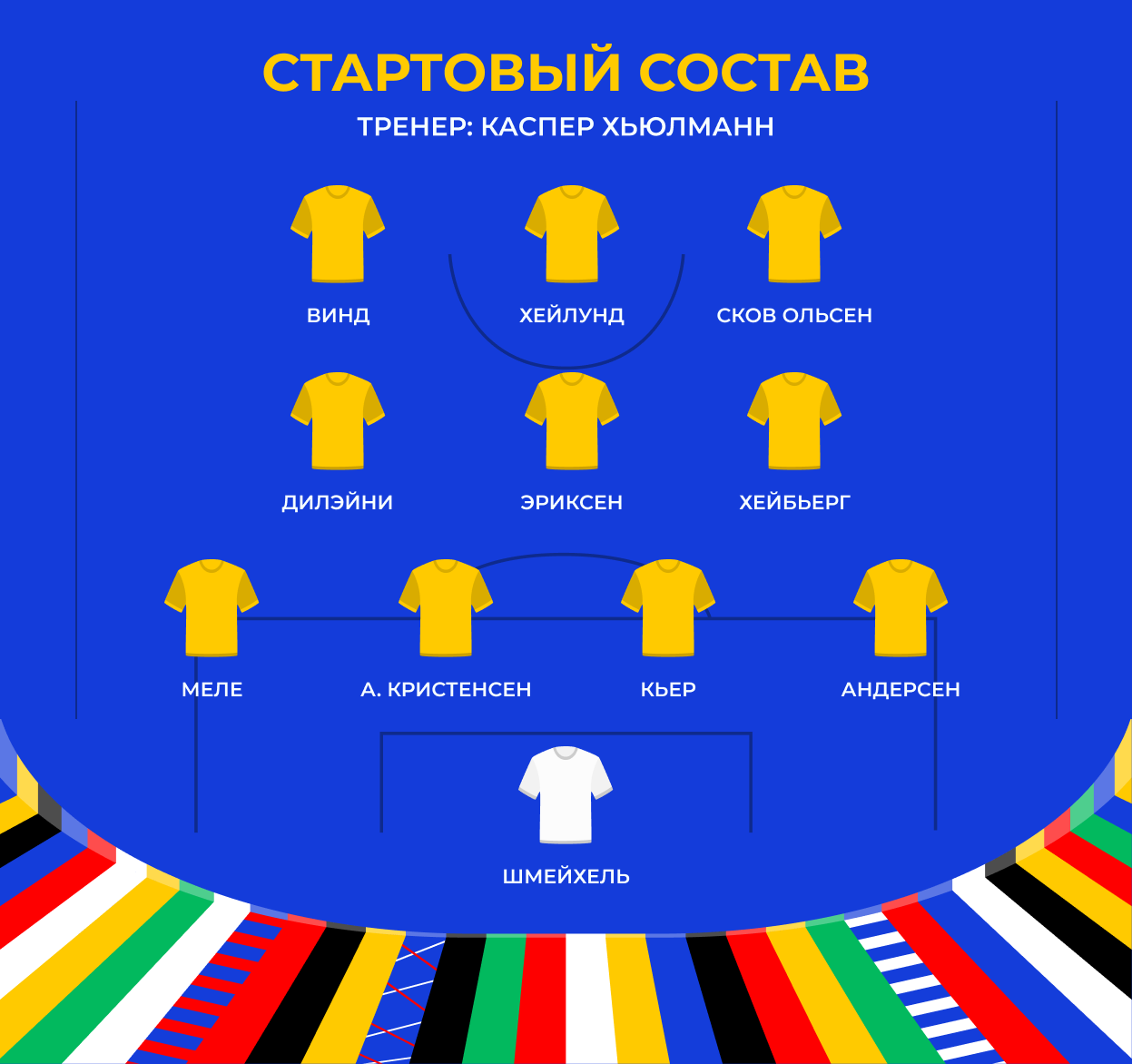 У датчан вполне сбалансированный состав. Все линии крепкие, есть глубина скамейке – не сравнится с топ-сборными, но тем не менее. В распоряжении тренерского штаба имеются как опытные бойцы, там и подающая надежды молодежь. Кьер, Эриксен, Шмейхель – чего только стоят эти фамилии. Есть и более юные таланты – например, Дарами и Хейлунд.