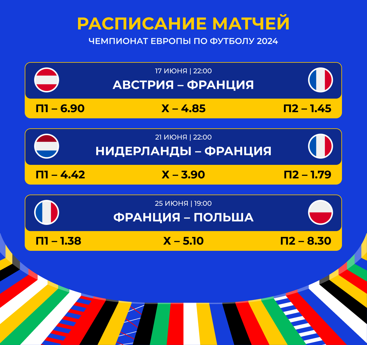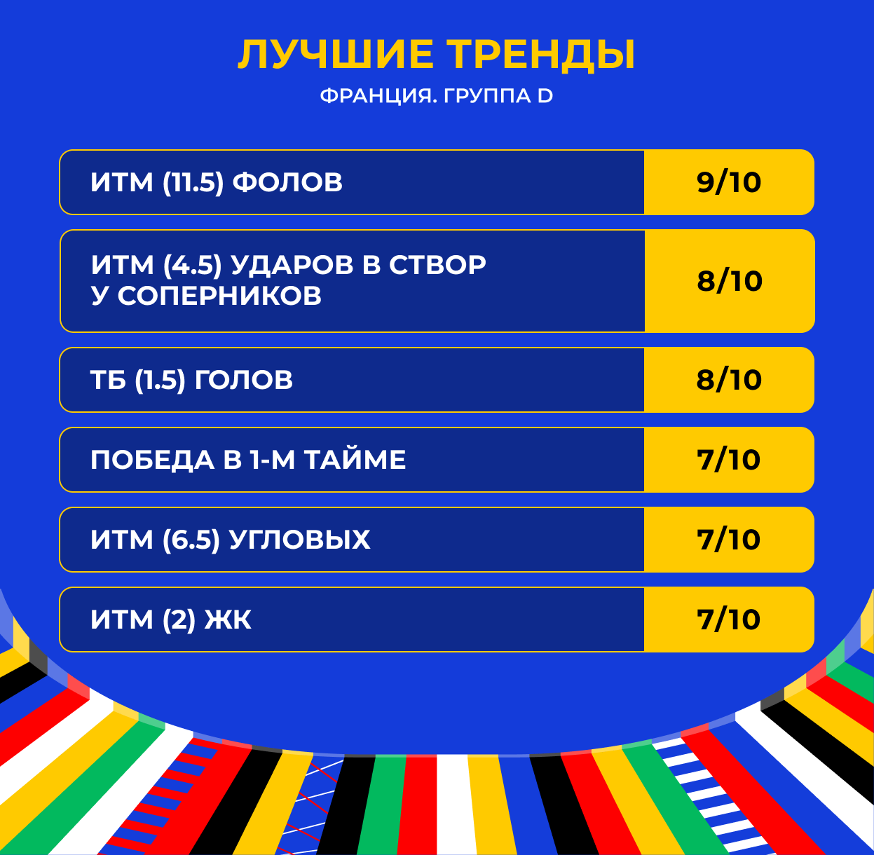 Франция очень уверенно прошла квалификацию Евро, победив в своей группе. Из последних поражений можно выделить только неудачу в контрольной встрече с Германией – 0:2. Не исключаем, что подобные эпизоды, в которых Франция будет терять очки, могут проскальзывать по ходу основной стадии Евро-2024. Но вряд ли они критически повлияют на конечный результат – выход французов из группы. Вот только кэф на это дают слишком мизерный – 1.04. Поэтому стоит рассмотреть альтернативные варианты.
