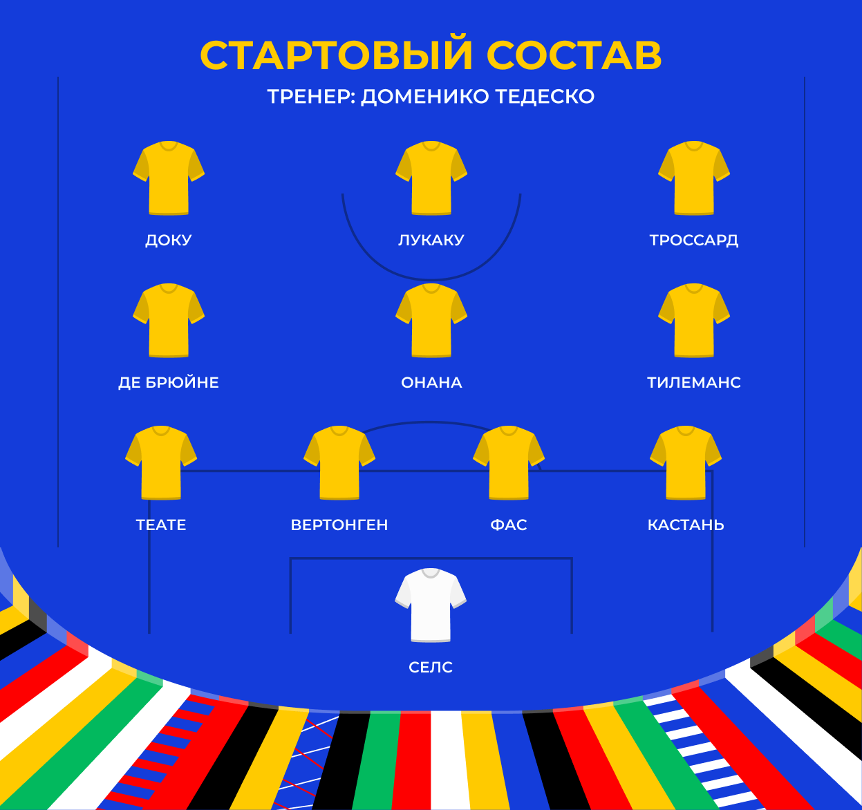 Полузащитники: Амаду Онана ("Эвертон"), Янник Феррейра Карраско ("Аль-Шабаб"), Астер Вранкс ("Вольфсбург"), Юри Тилеманс ("Астон Вилла"), Орель Мангаля ("Ноттингем Форест"), Кевин де Брюйне ("Манчестер Сити"), Артюр Вермерен ("Атлетико")
