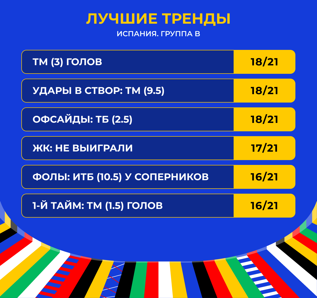 Ни для кого не секрет, что сборная Испании придерживается прагматичного футбола. Команда очень много владеет мячом и старается позиционно прорывать оборону. При таком стиле игры голевые феерии бывают крайне редко. Если взглянуть на статистику сборной Испании с 2022 года (при Де Ла Фуенте и Луисе Энрике), то получим 18 из 21 непроигрышей ставки ТМ (3) голов.