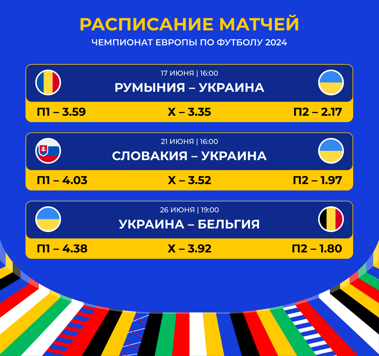 Следите за всеми играми сборной Украины на Евро 2024 вместе с букмекерскими конторами. Они предлагают интересные бонусы и фрибеты для всех клиентов, с помощью которых можно зарядить на игры ЧЕ по футболу.