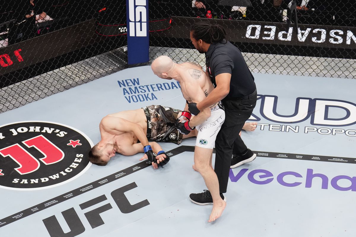Джош Эммет шел крупным андердогом против молодого проспекта Брайса Митчелла, но сделал то, что умеет едва ли не лучше всех в полулегком весе. Первые две минуты в октагоне ничего не происходило, однако первый же выпад Эммета стал роковым для его соперника. Нечасто мы видим столь устрашающие глухие нокауты после одиночного панча.