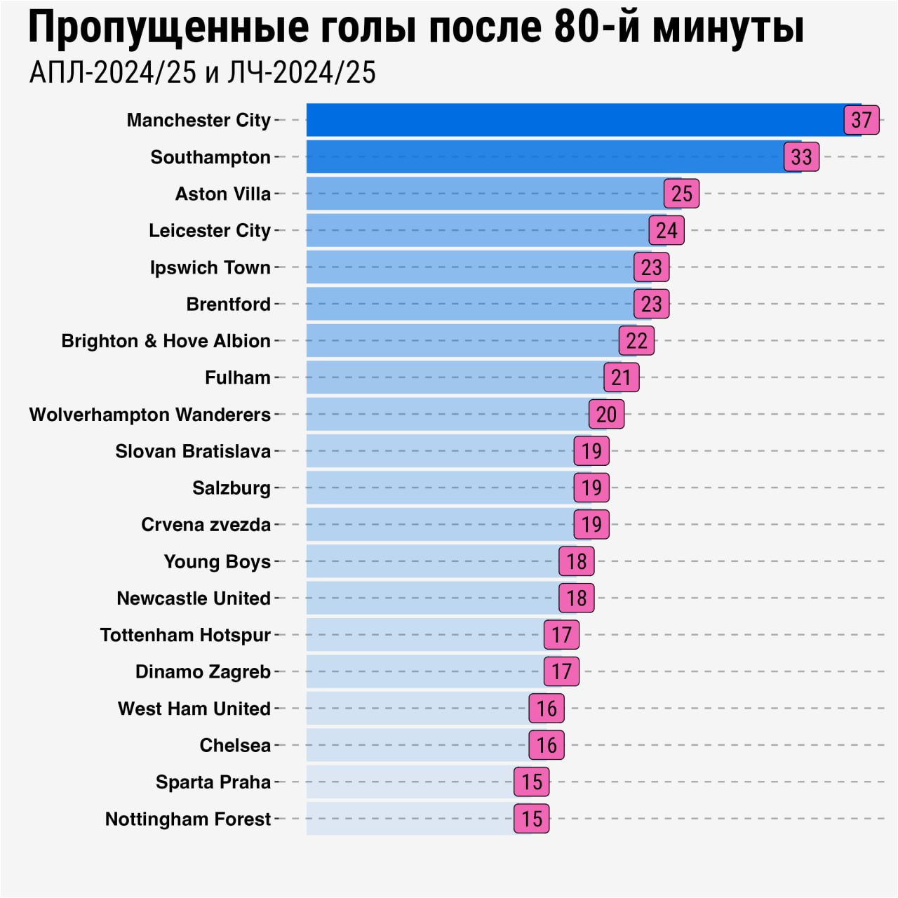 “Сити” с отрывом худший в АПЛ по пропущенным голам в конце матча. Более 70% всех мячей (!) пропущены в последние 10 минут