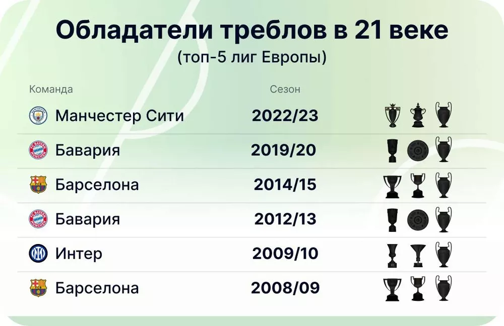 "Барселона" и "Бавария" добились этого невероятного триумфа дважды, а "Манчестер Сити" — последняя команда, которой удалось сделать требл, выиграв Премьер-лигу, Лигу чемпионов и Кубок Англии в сезоне 2022/23. Отметим интересный факт — в Северной Америке только три клуба: мексиканские "Крус Асуль" и "Монтеррей", а также тринидадская команда "Дефенс Форс" добились континентального требла.