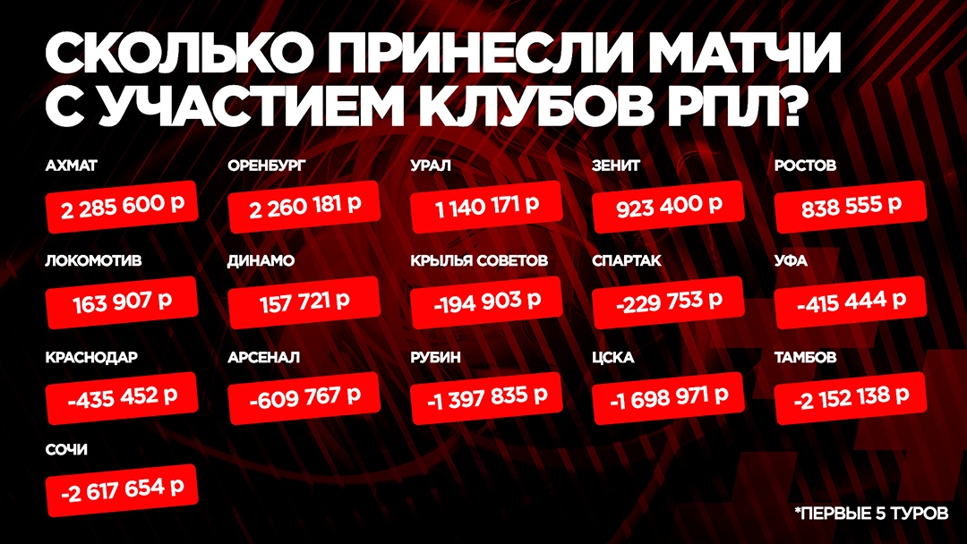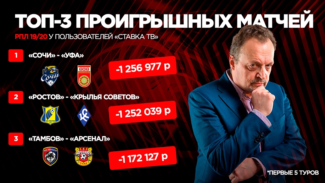 И чтобы никому не стало обидно, мы подсчитали, игры с участием каких команд были наиболее предсказуемы для наших пользователей. “Спартак”, например, принес почти полтора миллиона рублей в матче пятого тура, хотя до этого трижды из четырех случаев уводил капперов в минус. Одним словом, смотрите сами.