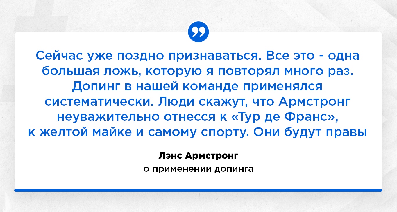 В начале 2000-х Армстронг был лучшим велогонщиком мира. На счету Лэнса сразу 7 побед в Тур де Франс — лучший показатель в истории велогонок. В 2012 году Армстронг, уже закончив карьеру, был признан виновным в применении запрещенных веществ. Его лишили всех регалий, ведь на протяжении всей карьеры он нарушал антидопинговые правила.