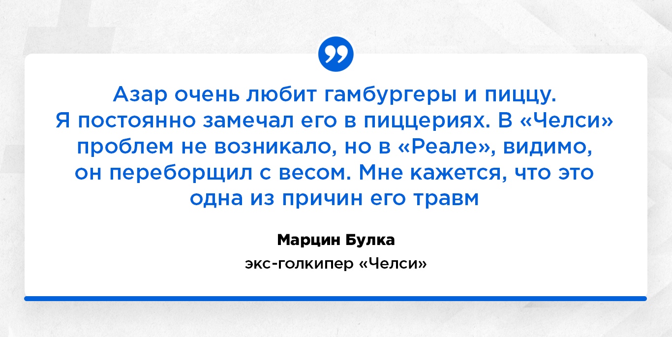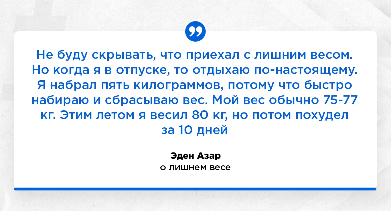 "Ваши ожидания — ваши проблемы". Эта фраза, сказанная Андреем Аршавиным, применима к трансферу Эдена Азара в "Реал". Бельгиец оказался в Мадриде с "небольшим багажом", который выпирал из-под футболки. На билбордах по всему городу красовалось лицо Эдена, в то время как тело было взято от Карима Бензема. Так "Реал" пытался скрыть лишние килограммы звездного новичка. Сам Эден заявил, что в межсезонье наслаждается отпуском, ни в чем себе не отказывая.
