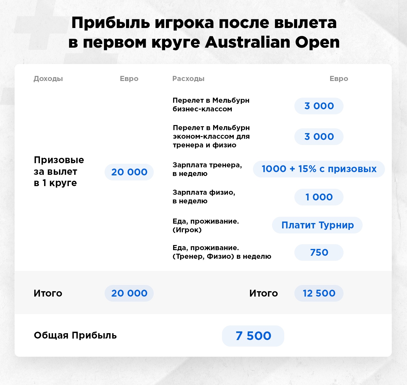 "Часто бывает за 10 лет карьеры ты зарабатываешь условные 1 миллион 900 тысяч долларов. Платишь 20% налога – и получается, что за год у тебя набегало примерно по 150 тысяч дохода при расходах как минимум в 100 тысяч. То есть, по сути, ты колесишь по миру 10 лет, а до этого было еще лет 15 тренировок, и зарабатываешь около 5 тысяч долларов в месяц. Вот на эту сумму ты и живешь – и считаешься удачливым игроком из первой сотни".