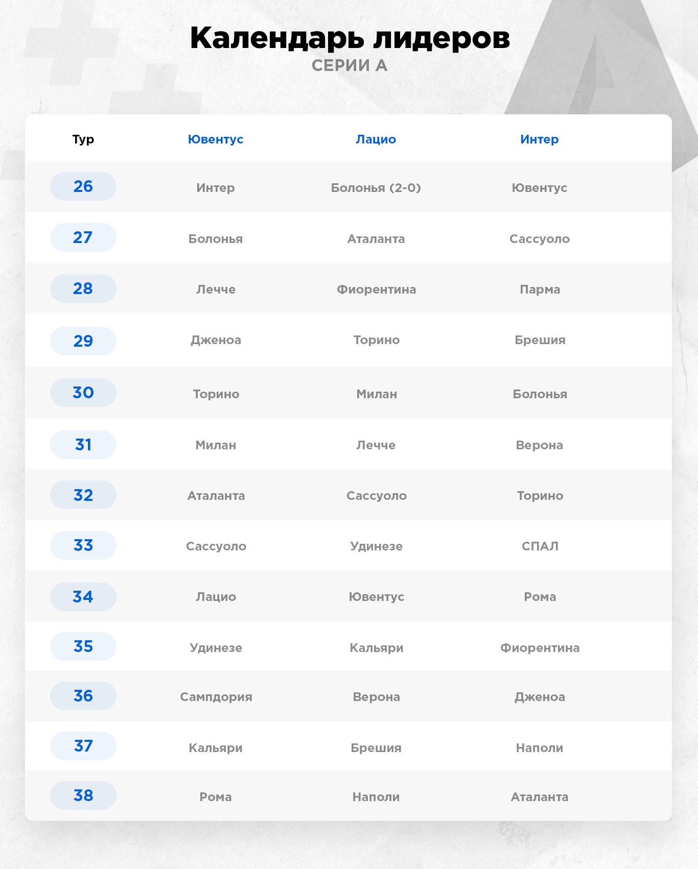"Лацио" не проигрывает в Серии А уже на протяжении 21-го матча, а вылет из Кубка Италии позволит "орлам" полностью сосредоточить свои силы на национальном первенстве, в отличие от своих основных конкурентов, которые до сих пор ведут борьбу на трех фронтах (Лига чемпионов/Лига Европы, Кубок Италии, Серия А). Для команды Индзаги это важнейший фактор в борьбе за Скудетто прямо сейчас, ведь глубина состава "лациале" не может сравниться с "Ювентусом" или "Интером". 12 финалов, пройти через которые нужно с минимальным количеством потерь в команде.