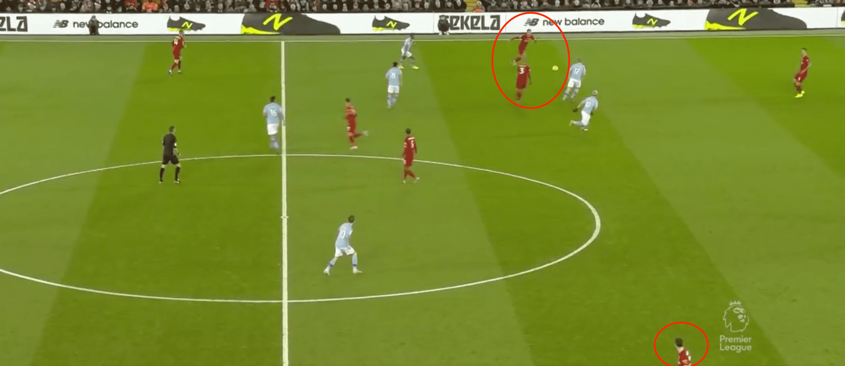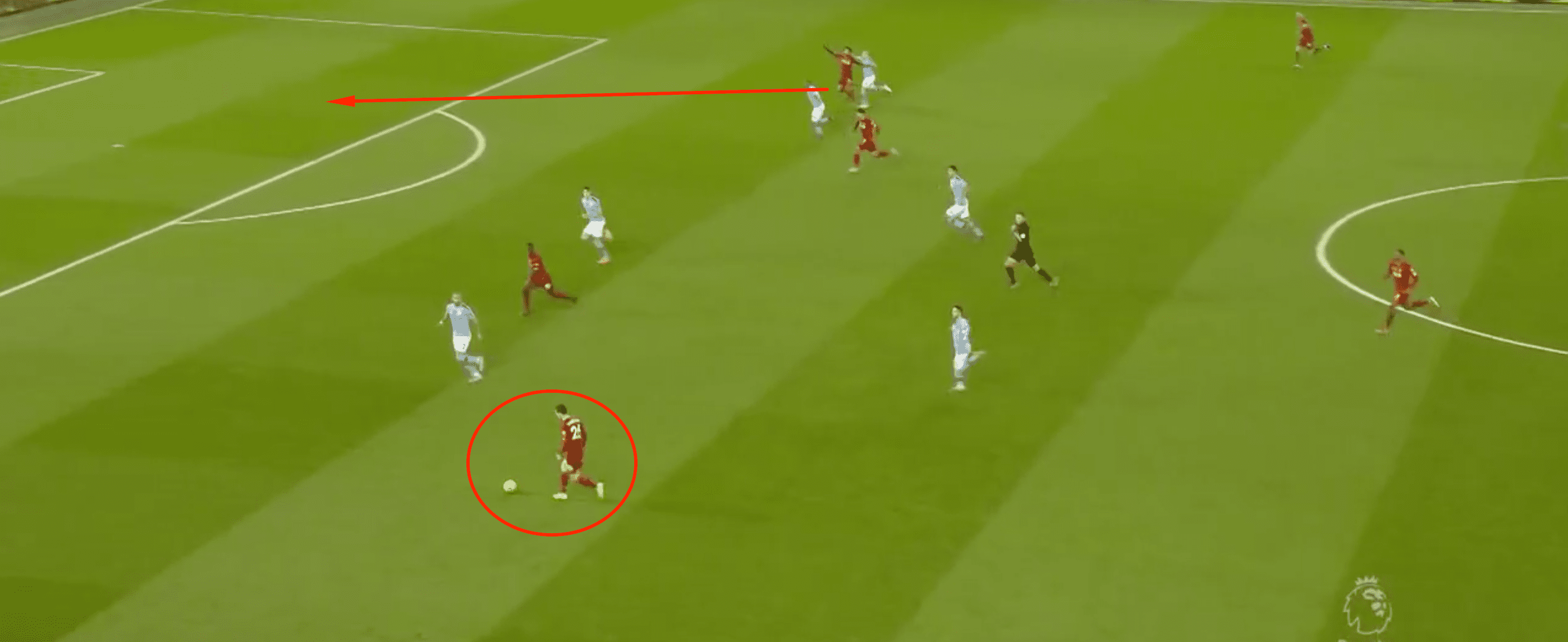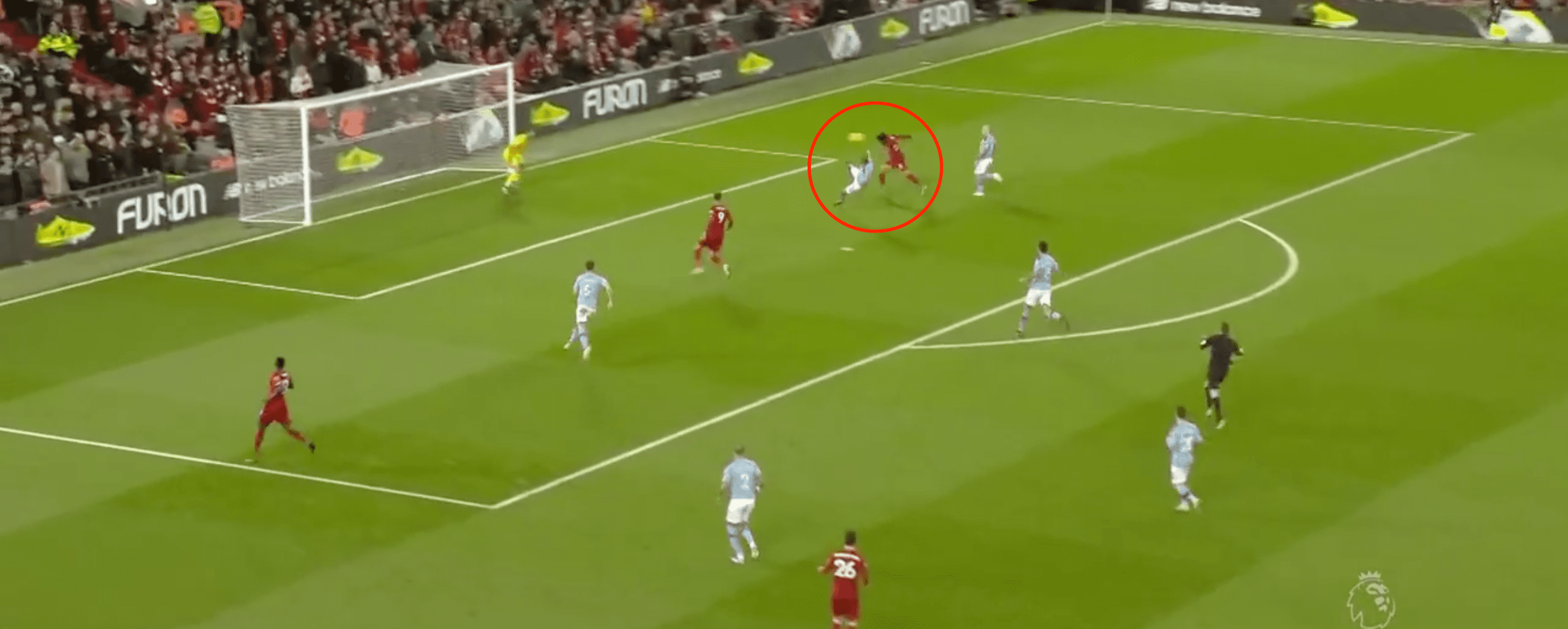 Трент получает мяч на правом фланге и с нерабочей левой отрезает пятерых игроков “Сити”.