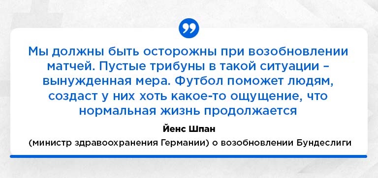 В Ла Лиге планируют доигрывать сезон с конца мая. АПЛ, как и французская Лига 1, вернется не раньше середины июня. Российская Премьер-Лига считалась фаворитом, если говорить о возвращении первой с карантина. Сейчас же идет речь о конце июня или даже начале июля. Если Бундеслига без проблем продолжит сезон, то их опыт поможет другим чемпионатам.