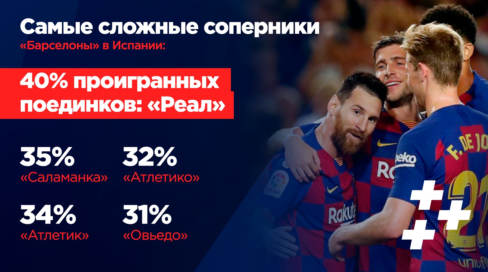 У "Барсы" все еще интереснее. В списке самых сложных соперников, например, нет "Валенсии" (27% проигранных матчей), зато "Саламанка", проведшая в Примере скромные 12 сезонов, сенсационно вторая. Город Саламанка находится в 80 км от португальской границы и местный стадион "Эльмантико" вообще стал для каталонцев чем-то вроде проклятой арены: сине-гранатовые приезжали туда 15 раз, но выиграли только трижды.